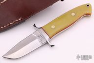 This Mini Chute Knife by Forge Master K. Ali features a mirror polished clip point blade with sharpened top edge, .213" blade stock and 1.250" blade depth, full tapered tang construction. The handle is comprised of a mirror polished stainless steel guard with yellow G-10 scales over red liners and brass/stainless steel pins. Includes original box and brown leather sheath. New from maker.