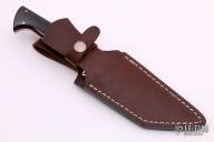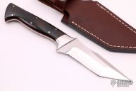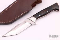 This Small Tanto from Forge Master K. Ali features a mirror polished clip point tanto blade with false top edge, .211" blade stock and 1.233" blade depth, full tapered tang construction. The handle has stainless steel bolsters and black/brown burlap micarta scales over red liners. Comes with original box and brown leather sheath. New from maker.