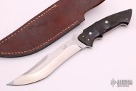 This Fighter from Forge Master K. Ali features a mirror finished recurve blade with false top edge, .192" blade stock and 1.636" blade depth, full tapered tang construction. The handle has black/brown burlap micarta scales with red liners, stainless steel pins, lanyard hole at the butt. New from maker. Includes brown leather sheath and original box.
