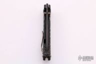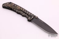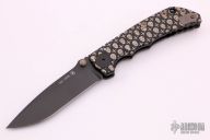 This Harsey framelock folder by Spartan Blades features a black drop point blade with dual thumbstuds and a notched thumbrest. The handle has a black titanium frame with a laser engraving a tip up titanium clip and filler tab. Has nice detent, lockup, and blade seating. Comes with original box. Excellent condition.