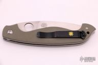 This Barong by Spyderco features a satin finished blade with thumbhole opening. The handle has green G-10 scales, stainless liners and tip up reversible clip. Includes the original box. Excellent condition.