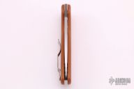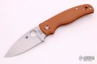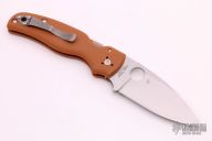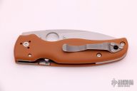 This Shaman Pin by Spyderco features a satin spear point REX 45 blade with notched thumb and finger rests, thumbhole. The handle has burnt orange G-10 scales, inlaid stainless steel liners and a black stainless steel backspacer, 4-way reversible stainless steel clip, lanyard hole at the butt. Comes with original box and papers. Excellent condition.