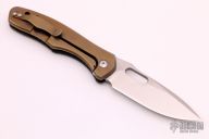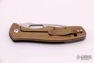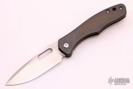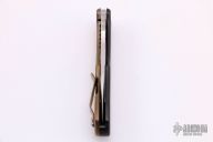 This Custom Spoke Prototype framelock from Gerry McGinnis features a tumble finished blade with thumbhole and notched thumbrest. The handle a carbon fiber front scale with green canvas micarta inlay, orange peel finished and anodized titanium lockside and tip up clip, black G-10 backspacer. Blade is centered when closed and locks up with no movement. This piece is marked "MCGINNIS PROTOTYPE" inside the handle, #007 and dated 8-7-18. Has a scuff/scratch near the butt of the frame, otherwise excellent condition.