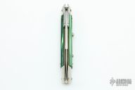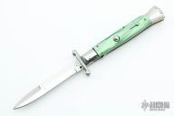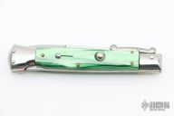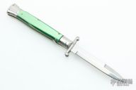 This Swing Guard Lockback Auto has a stonewashed stainless steel spear point blade with false top edge. Handle is green acrylic with stainless steel bolsters, brass liners, and stainless steel back spacer and lock. Has safety. Has some light scratches, otherwise excellent condition.