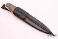 "I make mostly daggers, fighters and what I call “Kwaikens” but also swords and folding knives. I primarily use 1050 carbon spring steel and damascus of various compositions and on occasion, stainless steel for the blades. For the 1050 I employ a clay “tempering” technique that gives the blade a beautiful temper line (hamon) as well as a hard edge while maintaining a flexible core of the blade. These blades are rough ground and then finished off by hand with files and sandpaper before the final stage of etching the blade to bring out the hamon. When it comes to damascus, I tend to lean towards a simpler random or a twist pattern that goes with the overall simplistic scheme of my knives. These blades are worked and finished in a similar fashion as the carbon steel ones. I use stainless steel, mostly Damasteel stainless damascus, for folders, art knives ( for ex. Skull Cleaver and Druid Sickle) and some full-tang dress-knives, my Tuxer model, or upscale hunting/skinning-knives. For the handles and wooden sheaths I use rare exotic hardwoods, ancient ivories and bone material from all over the world. Even large pieces of natural amber has found its way onto a couple of my knives. A few wood favorites are Snakewood for its amazing striped grain pattern, Masur birch, Eucalyptus , and Redwood burl for its sometimes silky appearance."