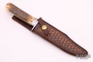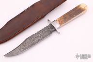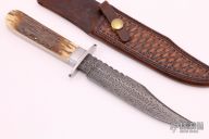 This knife by Dennis Friedly features a Damascus clip point blade with a file worked blade spine and a sharpened top edge.  .164" Blade Stock.  1.089" Blade Depth.  The handle features a steel guard, mammoth scales over a full tang construction.  Includes a brown leather sheath and a padded zippered case.  Excellent Condition.
