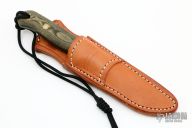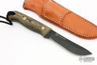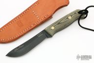 This knife by Chris Caine was made under Samuel Staniforth Sheffield England, it features a black blade with .193" blade stock and 1.108" blade depth full tang construction. The handle has green linen micarta scales. Comes with a brown leather sheath (not original, but fits). Has some light scuffs, otherwise excellent condition. Comes with cloth pouch.