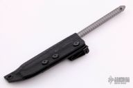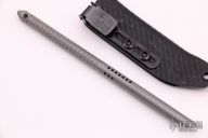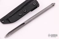 The Microtech TAC-P is a tactical spike with a wicked U' needle tip. The handle is jimped for a sure grip and it features a glass breaker and lanyard hole. This one has an apocalyptic finish. It includes a carbon fiber print kydex sheath with an Ulti-Clip. Comes with original box and papers. Excellent condition. S/N 1999 and dated 08/2020.