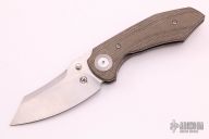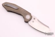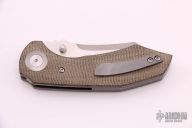 The Alliance Designs Bangarang is one of Matt's most popular designs which features a highly aggressive tactical blade paired with a hefty yet ergonomic handle. This particular variant features beautifully contoured Green Canvas Micarta scales, titanium pivot collars, and a machine satin finished blade. Not only does it look good, but its swoopy cutting edge makes this knife great for any task while still being extremely smooth and easy to manage. Blasted titanium liners, backspacer and tip up clip. Excellent condition.