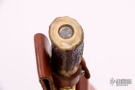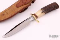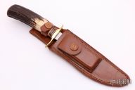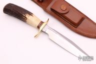 This Model 1-6 by Randall Made Knives features a clip point satin finished carbon steel blade with sharpened top edge, .222" blade stock. 1.121" blade depth, hidden tang construction. Brass guard, pinned sambar stag handle with red/white blue (7 spacers) spacers, compass in the butt. Includes the original HH Heiser brown leather sheath with brown buttons. This knife is vintage and was made circa 1960's. Back of blade reads "SAM D. MOGOL". Excellent condition for its age. I did some quick googling, and it seems there was a Sam D. Mogol that was in WWII. Not saying it's the same guy, but it could be and the age of the knife makes it a possibility.