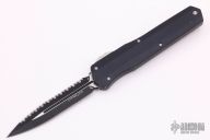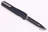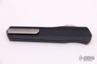 This Cypher OTF is a collaboration between Anthony Marfione and DC Monroe. It features a black double edged blade with satin flats and a fully serrated edge. The handle has a black anodized aluminum handle with blasted hardware, and a titanium tip down clip and a titanium insert at the butt. Comes with a Microtech box and papers. Has some scuffs and scratches and some wear on the handle finished, otherwise good condition. 02/2018 and #1014.
