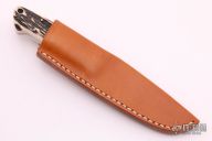 This integral Drop Point Hunter from Dietmar Kressler features a drop point hand rubbed satin finish blade with a notched thumbrest, .150" blade stock and .811" blade depth. The handle has integral fluted guard and beautiful stag scales with a tapered tang and red liners. Comes with a brown leather sheath with belt loop. Both knife and sheath are numbered "64". Excellent condition. A beautiful piece.
