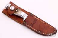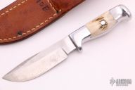This skinner by Ruana Knives features a satin finished blade with a hidden tang construction.  .112" Blade Stock.  .943" Blade Depth.  The handle is cast aluminum with elk horn inlays. Comes with a brown sheath. Excellent condition. Has some light scratches otherwise the knife is in good condition.