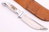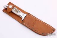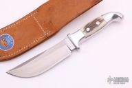 This Skinner by Rudy Ruana features an upswept blade with false top edge with .181" blade stock and 1.34" blade depth, hidden tang construction. The handle has a cast aluminum grip with elk horn inlays. Comes with original brown leather sheath. Excellent Condition.