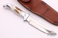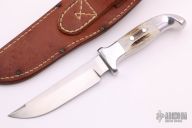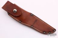 This Sticker by Ruana Knives features a satin finished blade with false top edge, .178" blade stock and 1.056" blade depth, hidden tang construction. The handle is cast from aluminum with elk inserts. Comes with brown leather sheath. Excellent Condition.