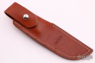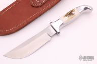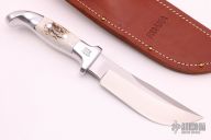 This Skinner by Ruana Knives features an upswept blade with false top edge with .168" blade stock and 1.306" blade depth, hidden tang construction. The handle has a cast aluminum grip with elk horn inlays. Comes with original brown leather sheath.  Excellent Condition.