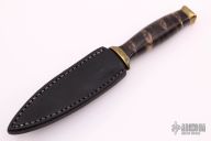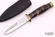 This Boot Knife from George Walker features a Damascus blade with a sharpened top edge, .202" blade stock and .860" blade depth, hidden tang construction. The handle is comprised of a brass guard and butt with stacked buffalo horn grip. Includes a black leather sheath with boot clip. Has some gaps between the horn pieces in the handle, otherwise excellent condition.