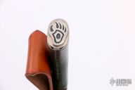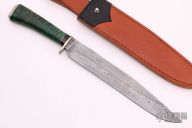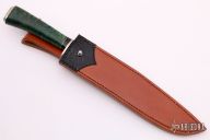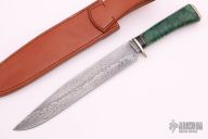 This Bowie by Keith Bagley has a Damascus blade with a nice temper line, .148" blade stock and 1.342" blade depth, hidden tang construction. The handle has a nickel silver guard, nickel silver butt with sterling silver paw print overlay, dyed box elder burl wood grip with black and nickel silver spacers. Includes a brown leather sheath. Excellent condition.