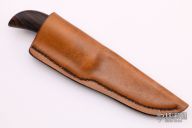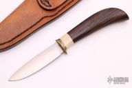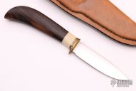 This Small Hunter by Karl Schroen features a satin finished blade with .082" blade stock and .815" blade depth, hidden tang construction. The handle has a bronze guard, walnut grip with a ground stag spacer. Comes with a brown leather sheath with "030" on the loop. Excellent condition.