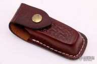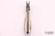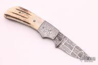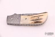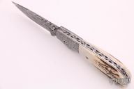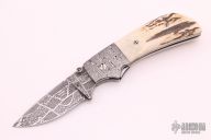 This linerlock by Chris Pennington features a Damascus blade with fileworked spine and single thumbstud with black lip pearl inlay. The handle has Damascus bolsters, stag scales, stainless steel liners and a fileworked Damascus backspacer. Comes with a hand tooled brown leather sheath. Nice detent, lockup and blade seating. Excellent condition.