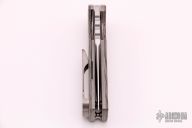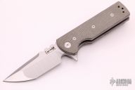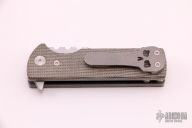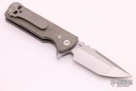This Chaves T.A.K. features a satin finished tanto blade with the Chaves logo and a notched thumbrest. The handle has green micarta scales over tumbled titanium liners and a matching reversible skull pocket clip. New From Maker!