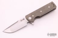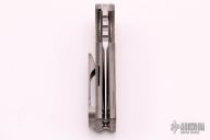 This Chaves T.A.K. features a satin finished drop point blade with the Chaves logo and a notched thumbrest. The handle has green micarta scales over tumbled titanium liners and a matching reversible skull pocket clip. New From Maker!