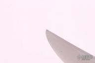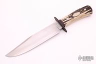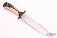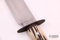 This Bowie by Master Smith Jerry Fisk features a hand rub satin finished blade with sharpened top edge, .187" blade stock and 1.504" blade depth, hidden tang construction. The handle has a black steel guard and fluted spacer and a two-piece stag handle with nickel silver escutcheon and two steel pins. Comes with a zippered case. Has a bent tip and a couple light scratches, otherwise good condition.