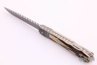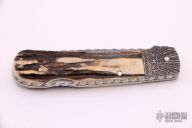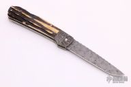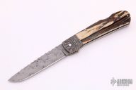 This Lockback by Ken Steigerwalt features a Damascus blade with nail nick and fileworked spine. The handle has Ken's classic scalloped and fluted Damascus bolsters, stag scales, fileworked nickel silver liners, fileworked stainless steel backspacer. Excellent condition. Very classy little piece.