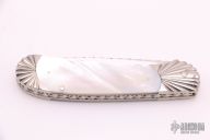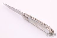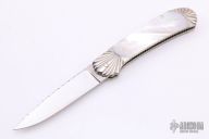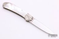 This Palm Release Auto by Ken Steigerwalt features a mirror polished blade with fileworked spine. The handle has scalloped and fluted nickel silver bolsters, front and rear, mother of pearl scales, fileworked nickel silver liners, fileworked stainless steel backspacer. Nice action, lockup and blade seating. Excellent condition.