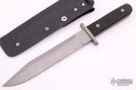 This Combat Fighter by Pat Crawford features a bead blast finished blade with a sharpened top edge, .245" blade stock and 1.447" blade depth, full tang construction. The handle has a bead blasted nickel silver guard and black linen micarta scales. Comes with a kydex sheath. Has a few light scratches/scuffs, otherwise excellent condition.