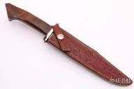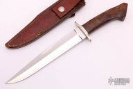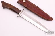 This Fighter by Jim Small features a mirror polished blade with a sharpened top edge, .178" blade stock and 1.250" blade depth, hidden tang construction. The handle has a nickel silver guard and a wood (walnut?) grip with nice contouring. Comes with a hand tooled brown leather sheath. Has a couple very light scratches, otherwise excellent condition.