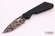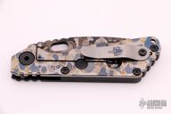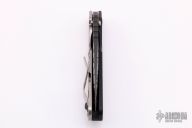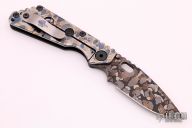 This SNG framelock folder by Mick Strider is a collaboration with Prometheus Design Werx, it features a drop point blade with frog skin pattern, notched thumbrest and a thumbhole. The handle has a frog skin pattern black aluminum and titanium frame with matching tip up titanium clip. Includes Hinderer "Lock Bar Stabilizer" for maximum reverse lock retention. Nice detent, lockup and blade seating. Excellent condition. Comes with a velcro case.