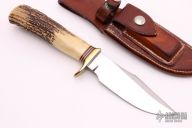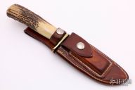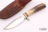 This Model 23 Game Master by Randall Made Knives features a stag grip with a brass guard and red, white and blue spacers. Has a satin finished blade with sharpened top edge and notched thumbrest, .212" blade thickness and 1.271" blade depth, hidden tang construction. Comes with a brown leather sheath. Has a few light scratches, otherwise excellent condition for this vintage Randall.