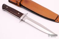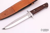 This Fighter by Reese Weiland features a mirror polished blade with sharpened top edge, .244" blade stock and 1.202" blade depth, full tapered tang construction. The handle has a stainless steel guard with desert ironwood burl scales and mosaic pins. Comes with a brown leather sheath. Excellent condition. Not a typical piece from Reese, but the customer whos knife this was, was good friends with Reese, and he made it for him.