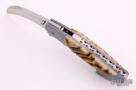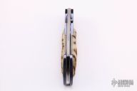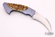 This Rastor by Reese Weiland features a hand rub satin finished hawkbill style blade with single thumbstud. The handle has anodized and orange peel finished titanium bolsters and liners, big horn sheep scales, and a fileworked stainless steel backspacer. Nice detent, lockup and blade seating. Comes with a zippered case. Excellent condition.