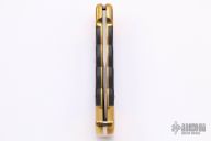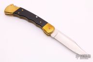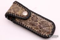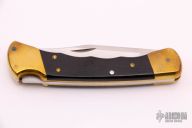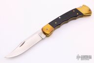 This Model 110 lockback folder by Buck Knives features a satin finished clip point blade with nail nick. The handle has brass bolsters/liners, ebony wood scales. Excellent condition. Comes with a custom snake skin sheath.