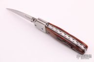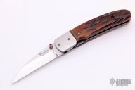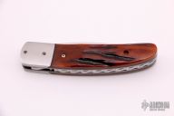 This linerlock by George Cousino features a hand rub satin finished blade with a red stone inlaid thumbstud and notched thumbrest. The handle has satin finished stainless steel dovetailed bolsters, jigged bone scales, titanium liners that are jeweled on inside, fileworked stainless steel backspacer. Nice lockup, detent, and seating. Has a few light scratches on the blade, otherwise excellent condition. Inside the backspacer it is marked "1109" and "027"