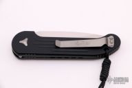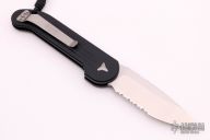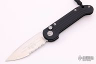 This LUDT auto by Microtech Knives has a satin finished blade with a partially serrated edge and a black aluminum frame with blasted hardware. Stainless steel clip. Dated 06/2019 and serial number 11874. Excellent condition.