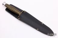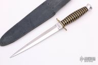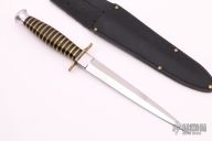 This Wasp Dagger by Nowill & Sons features a double-edged mirror polished blade, .202" blade stock and .834" blade depth, hidden tang construction. The handle has a brass guard, aluminum butt, and black/brass spacer pattern handle. Comes with a black leather sheath. Has a few light scratches, otherwise excellent condition.