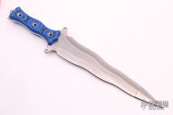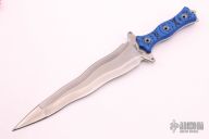 This Busse Combat Kris P Bacon 9.8 features a Competition Finished double-edged blade with corrugated bevel technology, .205" blade stock and 1.972" blade depth, full tang construction. The handle has Magnum Textured black/blue G-10 scales. Excellent condition.
