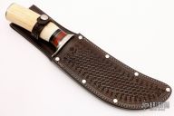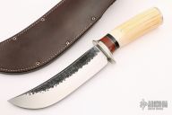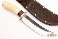This camp knife by Jim Behring features a satin finished blade with hammer marked flats, .249" blade stock and 1.787" blade depth, hidden tang construction. The handle has a nickel silver guard and butt cap, mammoth ivory grip with a hand peened nickel silver pin, red/nickel silver/black/brass/black linen micarta spacers.  Custom Mosher hand tooled brown leather sheath. Excellent condition.