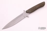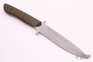 This is a rare pre-Benchmade Pacific Cutlery Fer De Lance. Design by David Steele. Bead blasted blade with sharpened top edge, .167" blade stock and 1.206" blade depth, full tang construction. The handle has green linen micarta scales with lanyard hole. Has a square mark on the top bevel near the plunge line, otherwise excellent condition.