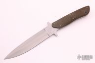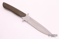 This is a rare pre-Benchmade Pacific Cutlery Fer De Lance. Design by David Steele. Bead blasted blade with sharpened top edge, .167" blade stock and 1.206" blade depth, full tang construction. The handle has green linen micarta scales with lanyard hole. Has a square mark on the top bevel near the plunge line, otherwise excellent condition.