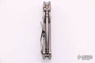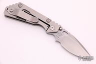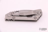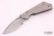 This PT by Mick Strider features a stonewashed blade with notched thumbrest and thumbhole. The handle has a stonewashed titanium frame with matching tip up clip. New condition.