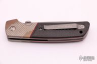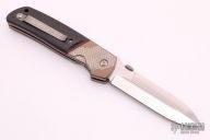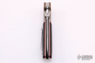 This ATCF by Bob Terzuola features a stonewashed spear point blade with notched thumbrest and a thumbdisc. The handle has super conductor bolsters, lightning strike carbon fiber scales, orange peel finished titanium liners, lightning strike carbon fiber backspacer, tip up titanium clip. Nice detent, lockup, blade seating. Excellent condition.