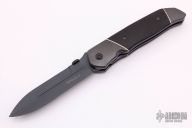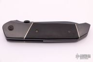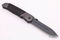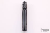 This Athena by Bob Terzuola features a black coated blade with notched thumbrest and a thumbdisc. The handle has double zirconium bolsters, ebony wood scales, anodized titanium liners, zirconium backspacer, sterling silver spacers. Nice detent, lockup, blade seating. Excellent condition.