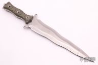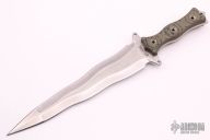 This Busse Combat Kris P Bacon 9.8 features a Competition Finished double-edged blade with corrugated bevel technology, .205" blade stock and 1.972" blade depth, full tang construction. The handle has Magnum Textured black/green G-10 scales. Excellent condition.