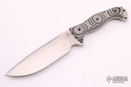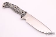 This Custom Shop Nano Fusion Natural Outlaw features a satin finished drop point blade with false top edge, .208" blade stock and 1.797" blade depth, full tang construction. The handle has hand sculpted black/grey G-10 scales with a lanyard hole at the butt.  Excellent Condition.