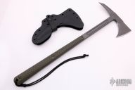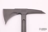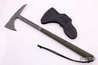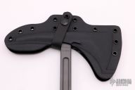 The Eagle Talon is the tomahawk that started it all. It was the first all-steel integral designed tomahawk and has been the keystone for all other RMJ tomahawks. It was inspired by 18th Century French and Indian War tomahawks that our designer, Ryan, had been emulating for many years. In the Spring of 2001, Ryan was commissioned by members of the USAF 820th Security Forces to design a tomahawk that featured 18th century lines and 21st century engineering; a tomahawk for modern combat use. Work began, and by the fall of 2001 the Eagle Talon Special Forces Tomahawk was being used in Afghanistan. Why a Tactical Tomahawk? The tomahawk has served as an effective field tool and weapon for over 300 years, and the physics behind the tomahawk design give it many advantages over a knife. The user can choke up on the grip to use the tomahawk like a more traditional knife, or when held in a normal grip, the cutting power and strike force is multiplied several times over due to the leverage created by the length of the handle. Great for: Breach | Utility | Emergency / Safety Tool | Preparedness Kit Specifications Overall Length: 7 in Overall Height: 18 in Forward Cutting Edge Length: 2.875 in Blade Thickness: .400 in Weight: 1 pound 15 ounces (without sheath) Blade Material: 80CRV2 Carbon Steel (HRC 57-58) Sheath: Molded kydex sheath and Low-Ride M.O.C. straps Comes with original packaging. New from maker.