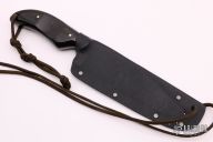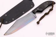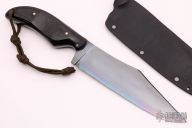 This Military Bowie by Fred Perrin features a black clip point blade with swedge and notched thumbrest, visible temper line, .147" blade stock and 1.732" blade depth, full tang construction. The handle is comprised of contoured black linen micarta scales with nickel silver pins and lanyard hole. Includes kydex sheath. New from maker.